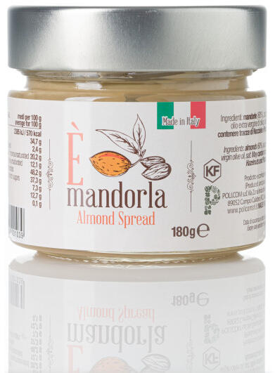 A teljes E' termékcsaládhoz hasonlóan ez a mandulakrém is prémium, kiváló minőségű recept alapján készült. 60%-ban egész hámozott mandulából készült, intenzív és jellegzetes ízű krém, mégis kiegyensúlyozott édességgel és tökéletes selymességgel. Összetevők : Mandula (60%) , cukor, extra szűz olívaolaj, só.