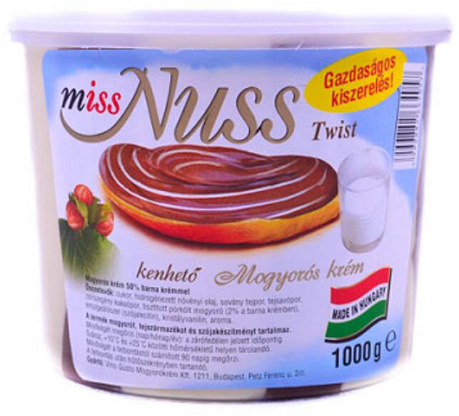 Cukor, Növényi zsír (pálma), Tejsavópor, Zsírszegény kakaópor, Tisztított pörkölt mogyoró (2% a barna színű krémben), Emulgeálószer (szójalecitin), Aromák: (kristályvanilin, mogyoró). Tápértékre vonatkozó adatok: Átlagos tápértékek 100 g termékben